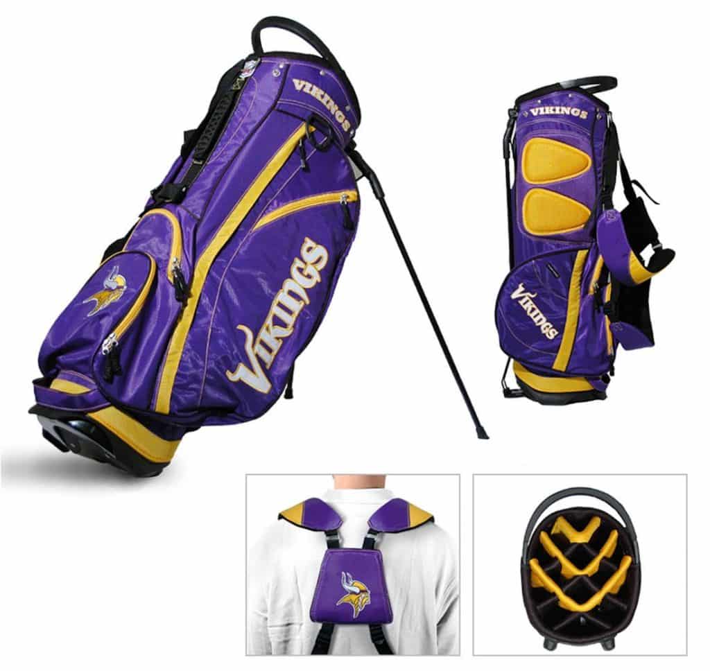 Minnesota Vikings Golf Stand Bag – Welcome to Detroit Game Gear here is the product description. This lightweight bag is also full of features, including integrated top handle, 14-way full length dividers, 6 location embroidery, 5 zippered pockets, 2 lift assist handles, cooler pocket, fleece lined valuables pouch, removable rain hood, umbrella holder and towel ring.