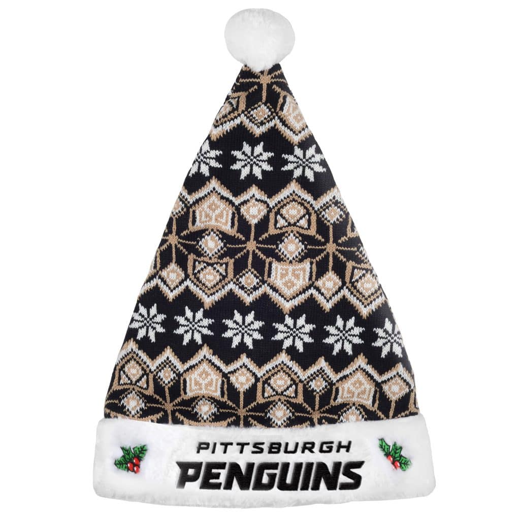 Pittsburgh Penguins 2015 Knit Christmas Santa Hat – These Christmas Santa Hats come in vibrant team colors with a huge team logo as the center point. Your favorite team’s name is embroidered across the lower part of the hat and centered in the front. Celebratethe christmas holiday in grand holiday style with these one size fits all santa hats!