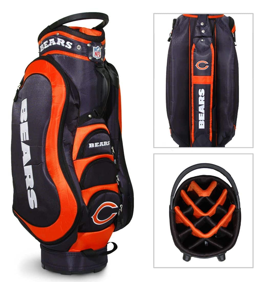 Chicago Bears Medalist Golf Cart Bag – Welcome to Detroit Game Gear here is the product description. This bag is loaded with features! Includes integrated top handle, 14-way full length dividers, 8 location embroidery, 5 zippered pockets, external putter well, 3 lift assist handles, padded strap with strap pouch, fleece lined valuables pouch, removable rain hood, umbrella holder and towel ring.