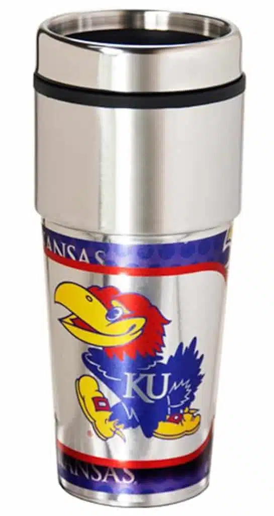Kansas Jayhawks 16 ounce Travel Tumbler with Metallic Graphics – Welcome to Detroit Game Gear here is the product description. This 16oz travel tumbler features a brilliant 360 degree metallic wrap. It also has a spill-resistant press-on lid, and fits in virtually any vehicle cup holder.