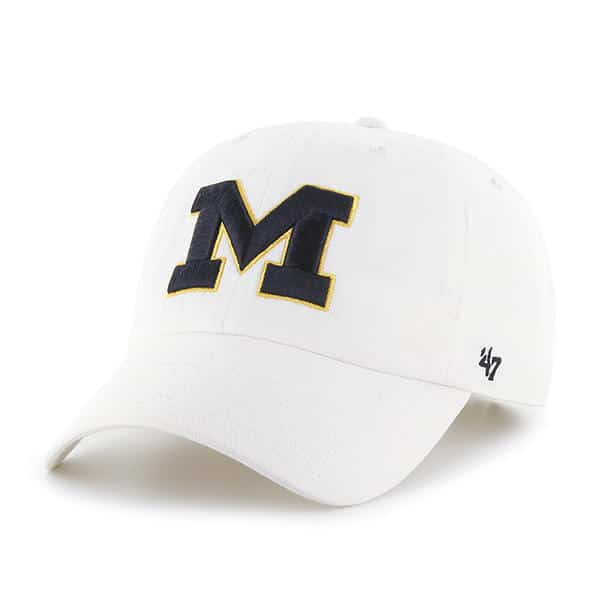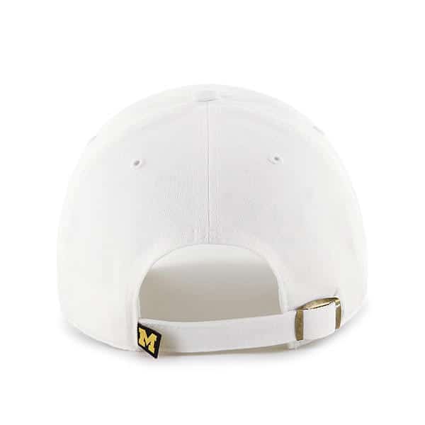 Michigan Wolverines 47 Brand White Clean Up Adjustable Hat – Made by 47 Brand and sold by Detroit Game Gear. Raised embroidery at front, officially licensed and one size fits most.