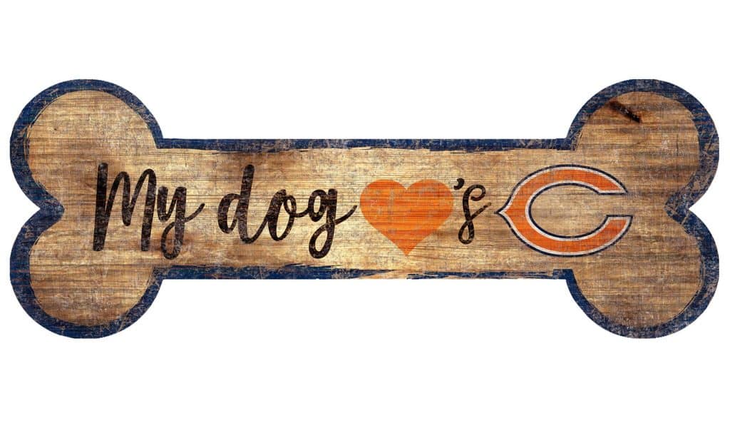 My Dog Loves Chicago Bears 6″x12″ Wood Bone Sign – Intentionally distressed art on cabinet grade MDF wood. Manufactured with a rope for easy hanging. Artwork digitally painted directly to the surface. Great for gift giving for any celebration. Made by Fan Creations.