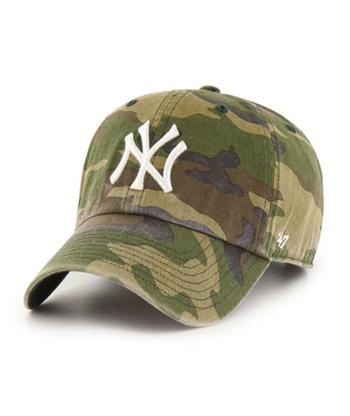The NY Yankees Camo ’47 Brand CLEAN UP is a relaxed and curved adjustable strapback with raised embroidery on the front and a loop label on the back.
