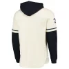 The NY Yankees ’47 Brand Cooperstown Cream Shortstop Pullover is made from midweight fleece with a soft, brushed interior. It features contrast sleeves and hood for a layered look. This uniform inspired silhouette has twill appliques across the chest featuring official wordmarks, team logos on the left sleeve, and an AL or NL logo on the right sleeve.