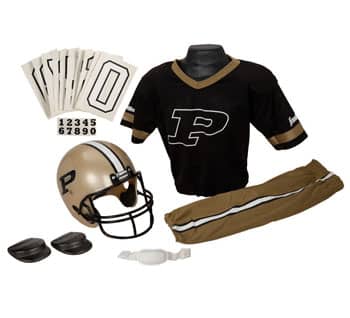 Purdue Boilermakers Football Deluxe Uniform Set – Size Medium – Welcome to Detroit Game Gear here is the product description. The authentic deluxe team uniform set is new and improved! The new molded helmet features authentic team colors and comes with a chin strap. The upgraded jersey is now made of 100 percent polyester-mesh jersey material and has integrated, removable plastic shoulder pads. The pants are 100 percent double-knit polyester with and elastic waistband and cuffs. The uniform set also comes with iron-on number kit (#