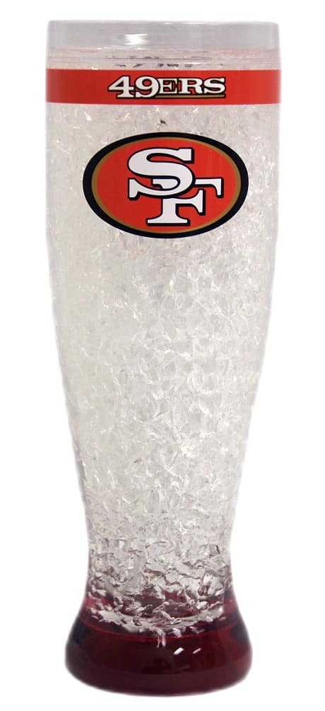San Francisco 49ers Crystal Pilsner Glass – Welcome to Detroit Game Gear here is the product description. It’s easy to enjoy a thirst quenching frosty beverage with this glass! This handsome 16 ounce plastic pilsner glass will keep your beverage ice cold without the ice. Features eye catching crystals between the outer and inner layer and a color coordinating base. Made by Duck House Sports.