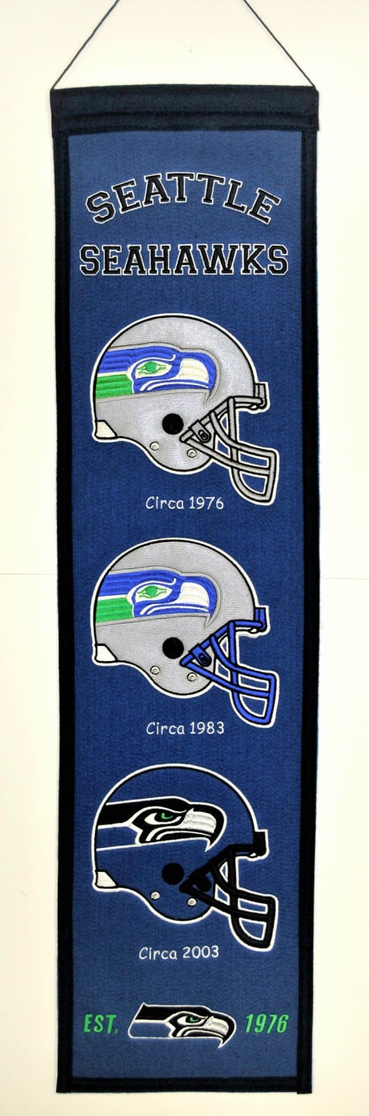 Seattle Seahawks Wool 8″x32″ Heritage Banner – Welcome to Detroit Game Gear here is the product description. These uniquely shaped vertical banners chronicle the evolution of select logos or mascots through the years. Each logo is identified with a circa date connecting each to a specific time period. Each banner is constructed with appliqu