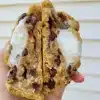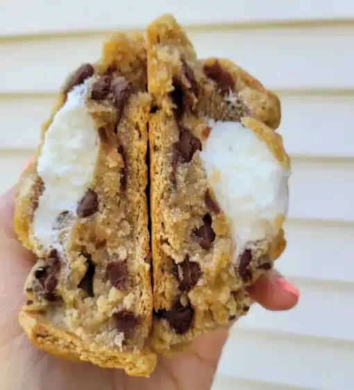 Who’s ready to light that fire and bring back your childhood memories. The graham cracker base is mixed with chocolate chips, stuffed with a large marshmallow and has a graham cracker bottom for some extra crunch.